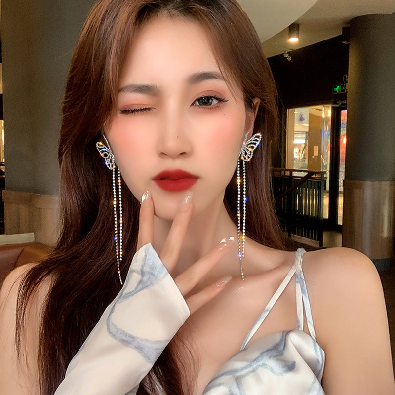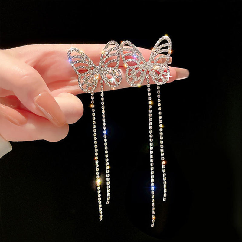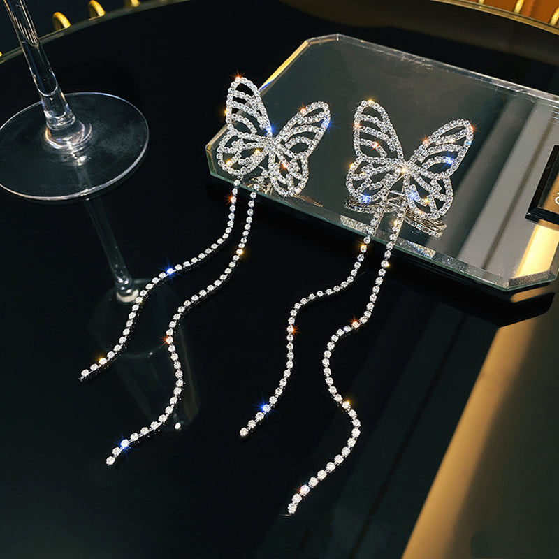 Tassel Butterfly Earrings For Women Shiny Rhinestone Big Bowknot Creative
